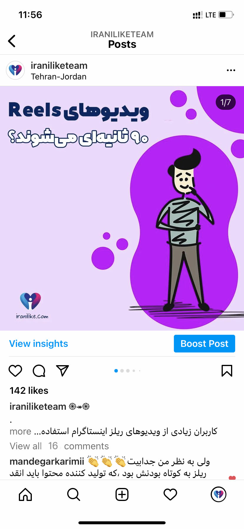 شما می توانید متناسب با نیاز خود کامنت های ایرانی سفارشی با متن دلخواه خود را تایپ و تعیین نمایید تا بعد از ثبت سفارش توسط تیم حرفه ای ایرانی لایک توسط کاربران واقعی و فعال اینستاگرام برای پست مورد نظر ارسال شود.